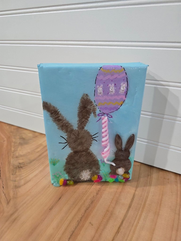 This 5x7x1.5″ canvas is full of Easter and Spring. We will paint on wood and canvas. I will teach you how to paint the bunny fur. The embellishments are numerous glass ribbon, jelly beans, fur tail, balloon decor, and resin! This class is $35.