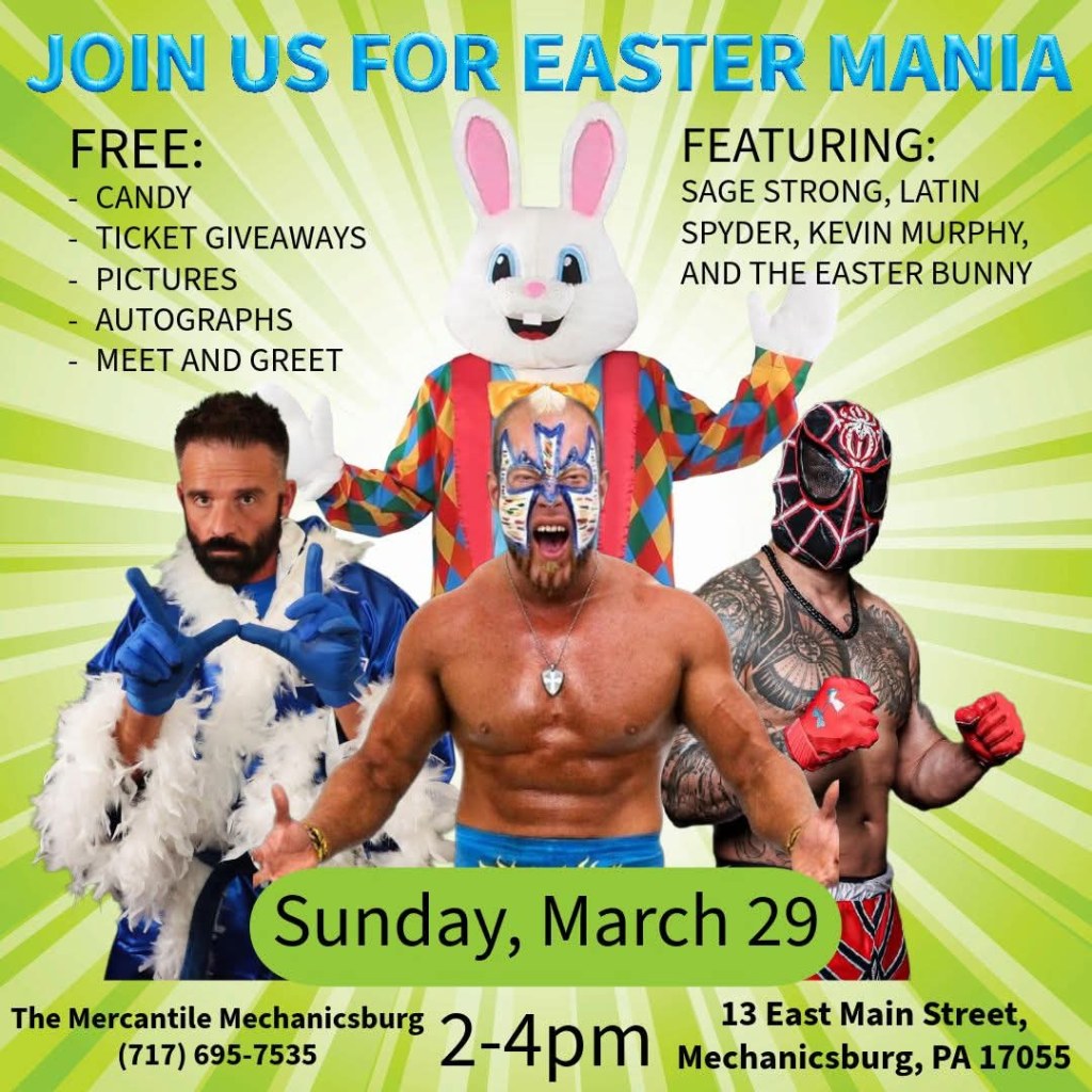 Join us at The Mercantile for Easter Mania! Enjoy FREE candy, pictures, & Autographs!Meet Local Pro Wrestlers: Sage Strong, Latin Spyder, & Kevin Murphy along with The Easter Bunny! We will also have ticket giveaways for A Night to Remember III, Super Star Wrestling on April 26th at the Zembo Shrine!